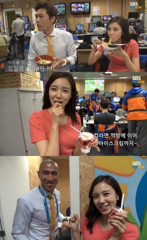 장예원 아나운서는 컵라면 먹방에 이어 아이스크림 먹방까지 선보였다. 장예원은 "차두리 해설위원님이 쏜 것이다. 아이스크림 먹고 싶었는데 너무 좋다"며 맛있게 아이스크림을 먹었다. 이어 차두리 해설위원은 감사의 인사를 전하러 온 장예원을 향해 쑥스러운 미소를 지어 눈길을 끌었다.