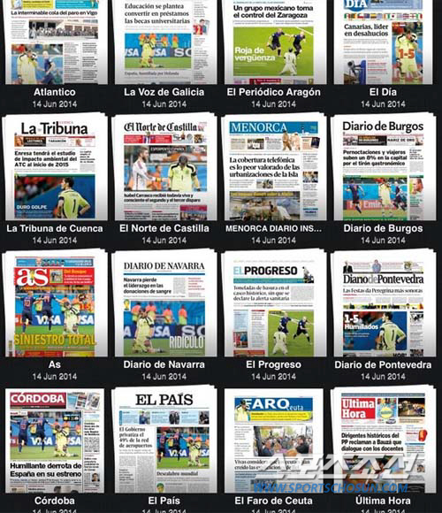 비센테 델 보스케 감독이 이끄는 스페인 축구대표팀이 2014 브라질월드컵에서 단 2경기만에 탈락이 확정됐다. 초상집 분위기인 스페인 언론들은 이날 1면에 일제히 좌절하는 카시야스의 모습을 실었다.
