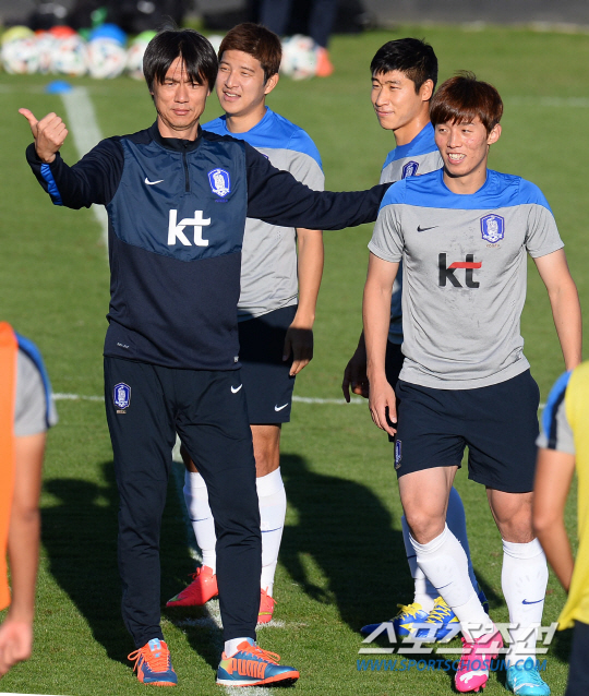 브라질월드컵 조별예선 2차전을 앞둔 홍명보호가 20일 오전(한국시간) 이구아수 플라멩고 경기장에서 알제리전을 향한 훈련에 돌입했다. 홍명보 감독이 선수들을 키순서에 따리 일렬로 세운후 팀을 분배하고 있다. 대표팀은 평균신장으로 세팀으로 나뉘어 패스게임을 진행했다.