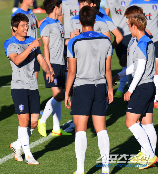 브라질월드컵 조별예선 2차전을 앞둔 홍명보호가 20일 오전(한국시간) 이구아수 플라멩고 경기장에서 알제리전을 향한 훈련에 돌입했다. 대표팀의 최장신 공격수 김신욱이 키재기 심판으로 나서 구자철과 손흥민의 키를 재주고 있다. 선수들은 평균키로 세팀으로 나뉘어 패스게임을 진행했다. 대표팀은 평균신장으로 세팀으로 나뉘어 패스게임을 진행했다.
