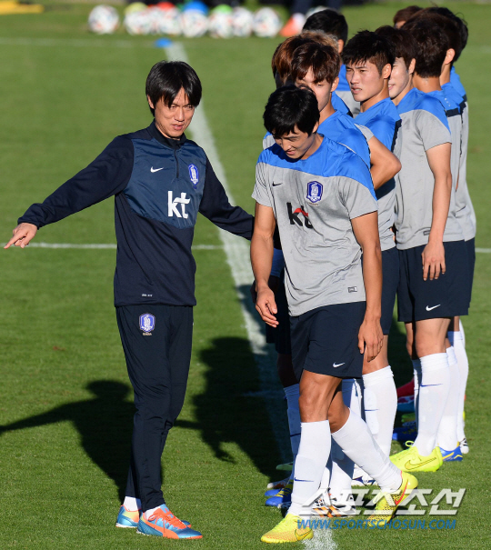 브라질월드컵 조별예선 2차전을 앞둔 홍명보호가 20일 오전(한국시간) 이구아수 플라멩고 경기장에서 알제리전을 향한 훈련에 돌입했다. 홍명보 감독이 선수들을 키순서에 따리 일렬로 세운후 팀을 분배하고 있다. 대표팀은 평균신장으로 세팀으로 나뉘어 패스게임을 진행했다.
