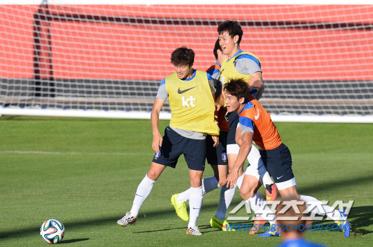 브라질월드컵 조별예선 2차전을 앞둔 홍명보호가 20일 오전(한국시간) 이구아수 플라멩고 경기장에서 알제리전을 향한 훈련에 돌입했다.이용과 박종우가 패스게임중 볼을 다투고 있다. 대표팀은 키크기에 따라 세팀으로 나뉘어 패스게임을 진행했다.