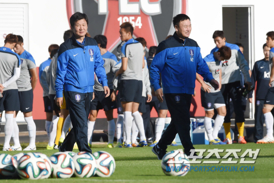 브라질월드컵 조별예선 2차전을 앞둔 홍명보호가 20일 오전(한국시간) 이구아수 플라멩고 경기장에서 알제리전을 향한 훈련에 돌입했다. 정몽규 대한축구협회장과 허정무 부회장이 선수들의 훈련을 지켜보고 있다.