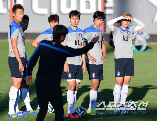 브라질월드컵 조별예선 2차전을 앞둔 홍명보호가 20일 오전(한국시간) 이구아수 플라멩고 경기장에서 알제리전을 향한 훈련에 돌입했다. 홍명보 감독이 공격수들에게 슈팅방법을 지도하고 있다.