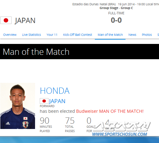 혼다 케이스케가 국제축구연맹(FIFA) 일본-그리스전 '맨오브더매치'에 선정됐다.