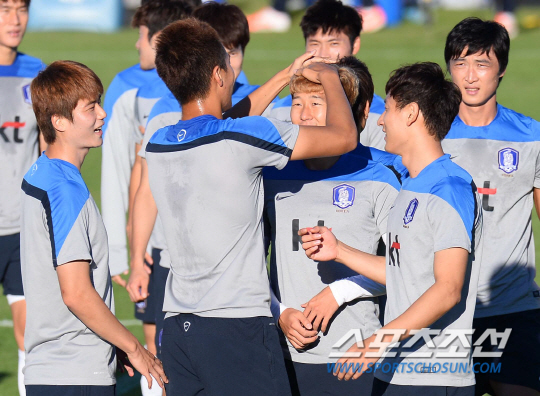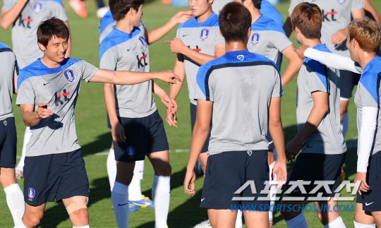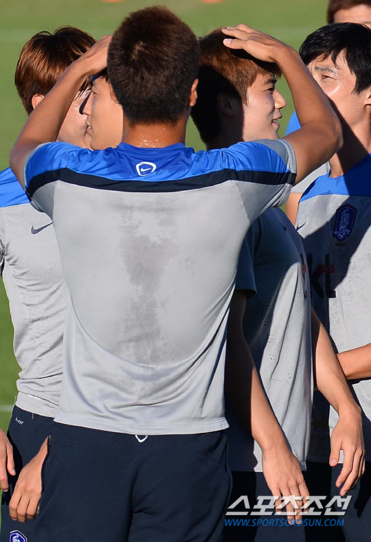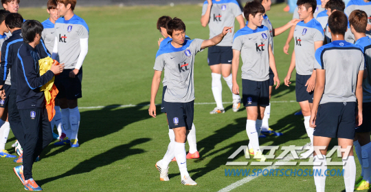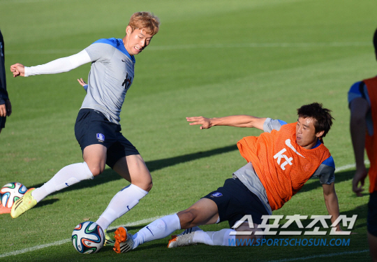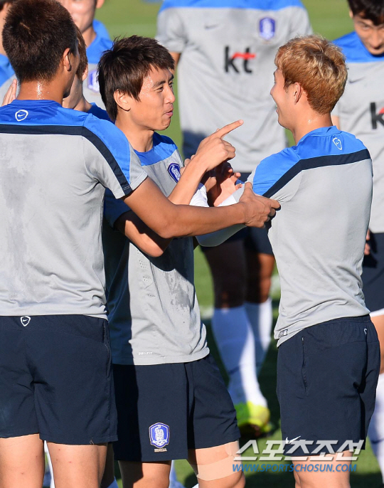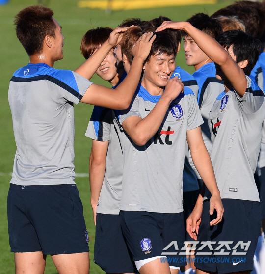 브라질월드컵 알제리와의 2차전을 앞두고 이구아수 캠프에서 맹훈련중인 태극전사들이 20일(한국시간) 훈련중에 갑자기 키재기 경쟁에 돌입했다. 평균키로 이루어진 세팀을 만들어 게임을 벌이기 위해 줄반장을 자처한 홍명보 감독이 김신욱을 기준으로 줄을 세운것이다. 자타가 공인하는 '최장신 국가대표' 김신욱은 '줄반장' 홍감독의 지시에 따라 도토리 키재기 중인 '숏다리' 동료들의 심판으로 변신했다. 김신욱은 서로 앞에 서겠다고 벌어진 선수들의 분쟁(?)에 포청천으로 나서 '롱다리 카리스마'를 발휘했다.