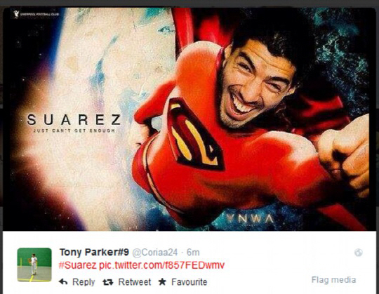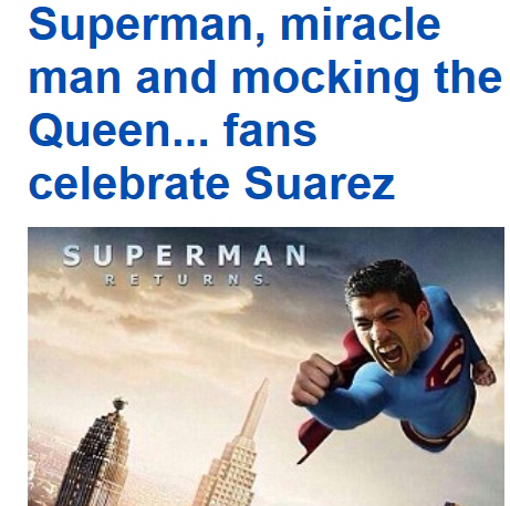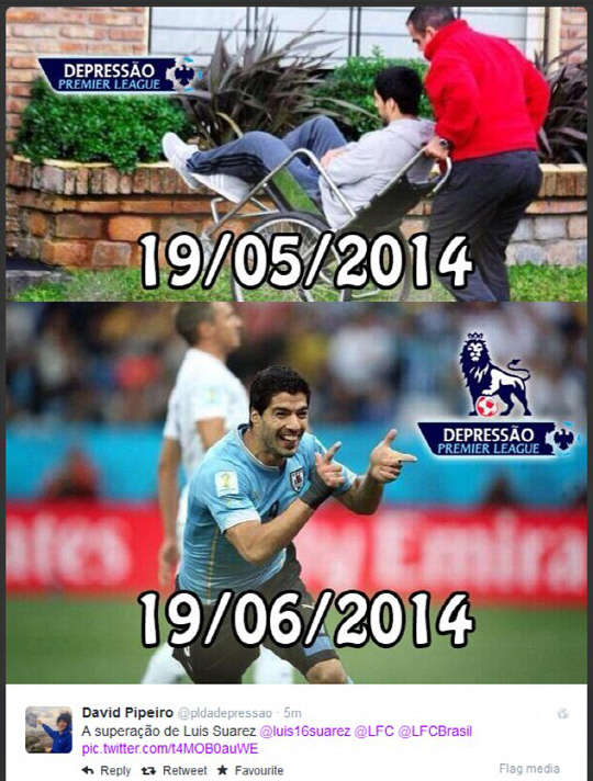 2연패의 악몽속에서도 잉글랜드 축구팬들은 SNS를 통해 특유의 시니컬한 블랙유머를 공유하며 위기를 즐기고 있다. '수아레스 패러디' '잉글랜드 자학 개그'가 폭발적인 인기를 끌고 있다. 불과 한달만에 부상을 털고 일어나 2골을 몰아친 수아레스를 슈퍼맨에 비유하는가 하면, 수아레스가 손가락으로 옆쪽을 가리키는 짜릿한 골 세리머니 사진 아래 '잉글랜드, 공항은 저쪽이야'라는 설명을 달았다. 관중석의 즐라탄 아래는 '조하트 걱정마, 나는 그라운드에 안 들어갈테니'라는 코믹한 글을 달았다. 애니메이션 '심슨'에서 군중들이 싸늘한 표정으로 노려보는 한장면을 따붙인 후 '내년 시즌 수아레즈가 돌아온 리버풀 라커룸 표정'이라고 썼다.
