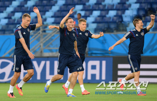 2014브라질월드컵 조별예선 H조 1차전에서 한국과 맞붙을 러시아대표팀 주장 바실리 베레주츠키가 경기를 하루 앞둔 17일 오전(한국시간) 쿠이아바 아레나 판타날 경기장에서 적응훈련을 하고있다. 쿠이아바(브라질)=최문영 기자 deer@sportschosun.com