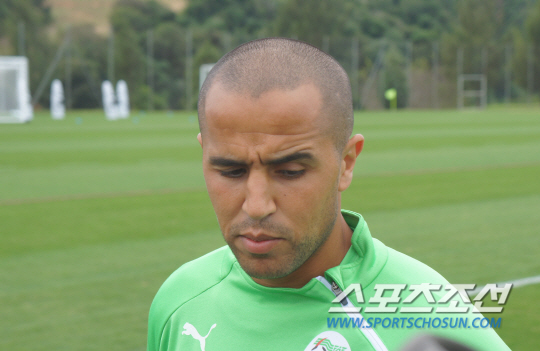 20일 브라질 상파울루 인근 소로카바에서 훈련에 앞서 믹스트존 인터뷰를 하고 있는 알제리대표팀의 주장 부게라. 상파울루(브라질)=하성룡 기자