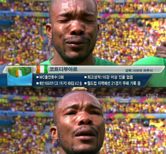 코트디부아르 대표팀 미드필더 세레이 디에(30·FC 바젤)가 국가를 들으며 눈물을 흘렸다.