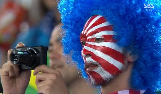 이날 전반 30분 경 경기 장 중계카메라에는 얼굴에 전범기를 그린 한 일본관중의 모습이 포착됐다.