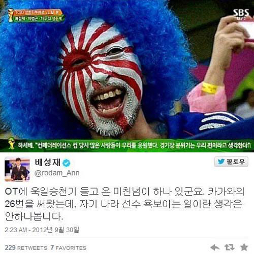 배성재 아나운서는 지난 2012년 9월 30일 맨체스터 유나이티드 경기를 준비하던 중 올드 트래포드에서 전범기를 발견하자 "OT에 욱일승천기 들고 온 미친X이 하나 있군요. 카가와의 26번을 써왔는데, 자기 나라 선수 욕보이는 일이란 생각은 안하나봅니다"라고 말하기도 했다.