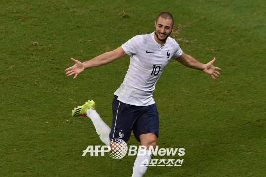 | ◇프랑스의 벤제마가 21일 스위스전에서 3호골을 터트린 후 환호하고 있다. 사우바도르(브라질)=ⓒAFPBBNews = News1 |