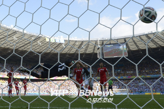 아르헨티나가 이란에 극적인 승리를 거두며 2연승을 거두었다. 22일(한국시각) 브라질 벨루오리존치 에스타디오 미네이랑에서 열린 2014 브라질월드컵 F조 조별리그 2차전 이란과의 경기에서 아르헨티나는 고전끝에 1-0의 승리를 거두었다. 후반 종료 직전 메시의 감아차기 중거리슛이 이란 골키퍼 하지지를 제치며 골망을 가르고 있다. ⓒAFPBBNews = News1