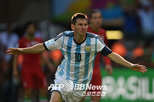 아르헨티나가 이란에 극적인 승리를 거두며 2연승을 거두었다. 22일(한국시각) 브라질 벨루오리존치 에스타디오 미네이랑에서 열린 2014 브라질월드컵 F조 조별리그 2차전 이란과의 경기에서 아르헨티나는 고전끝에 1-0의 승리를 거두었다. 후반 종료 직전 메시가 감아차기 중거리슛으로 결승골을 넣은 후 환호하고 있다. ⓒAFPBBNews = News1