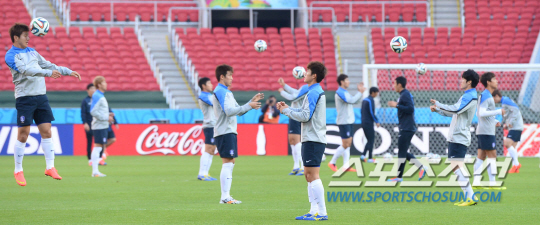 2014브라질월드컵에서 알제리와 조별예선 2차전을 하루 앞둔 홍명보호가 22일(한국시간) 포르투 알레그레의 에스타디오 베이라리오 경기장에서 훈련을 실시했다. 이용과 태극전사들이 헤딩연습으로 적응훈련을 하고 있다.