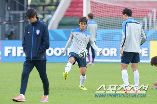 2014브라질월드컵에서 알제리와 조별예선 2차전을 하루 앞둔 홍명보호가 22일(한국시간) 포르투 알레그레의 에스타디오 베이라리오 경기장에서 훈련을 실시했다. 박주영과 기성용이 가벼운 패스연습으로 적응훈련을 하고 있다.