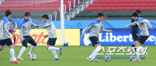 2014브라질월드컵에서 알제리와 조별예선 2차전을 하루 앞둔 홍명보호가 22일(한국시간) 포르투 알레그레의 에스타디오 베이라리오 경기장에서 훈련을 실시했다. 태극전사들이 가벼운 패스연습으로 적응훈련을 하고 있다.