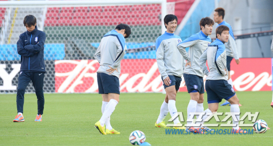 2014브라질월드컵에서 알제리와 조별예선 2차전을 하루 앞둔 홍명보호가 22일(한국시간) 포르투 알레그레의 에스타디오 베이라리오 경기장에서 훈련을 실시했다. 홍명보 감독이 적응훈련중인 태극전사들을 지켜보고 있다.