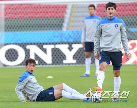 2014브라질월드컵에서 알제리와 조별예선 2차전을 하루 앞둔 홍명보호가 22일(한국시간) 포르투 알레그레의 에스타디오 베이라리오 경기장에서 훈련을 실시했다. 윤석영과 지동원이 가벼운 패스연습으로 경기장 환경에 적응하고 있다.