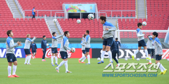 2014브라질월드컵에서 알제리와 조별예선 2차전을 하루 앞둔 홍명보호가 22일(한국시간) 포르투 알레그레의 에스타디오 베이라리오 경기장에서 훈련을 실시했다. 이용과 태극전사들이 헤딩연습으로 적응훈련을 하고 있다.