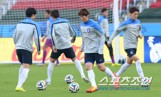 2014브라질월드컵에서 알제리와 조별예선 2차전을 하루 앞둔 홍명보호가 22일(한국시간) 포르투 알레그레의 에스타디오 베이라리오 경기장에서 훈련을 실시했다. 김보경과 태극전사들이 가벼운 패스연습으로 경기장 환경에 적응하고 있다.