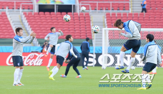 2014브라질월드컵에서 알제리와 조별예선 2차전을 하루 앞둔 홍명보호가 22일(한국시간) 포르투 알레그레의 에스타디오 베이라리오 경기장에서 훈련을 실시했다. 이용과 태극전사들이 헤딩연습으로 적응훈련을 하고 있다.