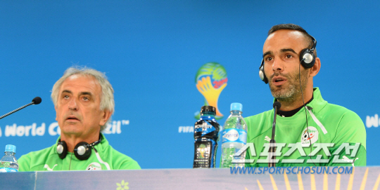 2014브라질월드컵에서 대한민국과 조별예선 2차전을 하루 앞둔 알제리의 바히드 할리호지치감독과 골키퍼 세드리크 시 무함마드가 22일 에스타디오 베이라리오 경기장에서 기자회견을 갖고 있다.
