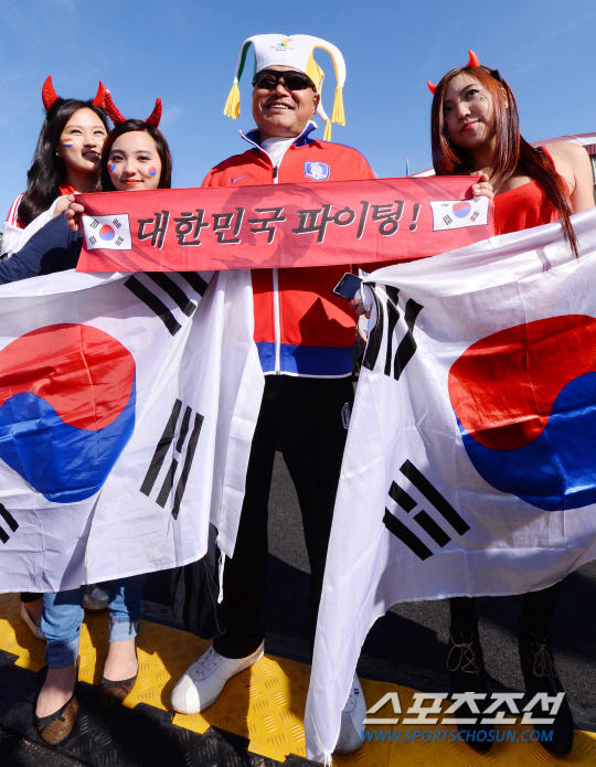 2014브라질월드컵 조별예선 대한민국과 알제리의 경기가 23일 (한국시간) 포르투 알레그레의 에스타디오 베이라리오 경기장에서 열렸다. 방송인 김흥국과 독특한 복장의 축구팬들이 경기전부터 응원전을 펼치고 있다.