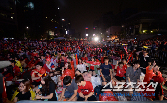 23일 새벽 브라질월드컵 대한민국과 알제리의 경기가 열리는 시간 서울 광화문과 영동대로 등 전국에서 대한민국을 응원하는 거리응원이 펼쳐졌다. 광화문을 찾은 수많은 시민들이 응원을 펼치고 있다.