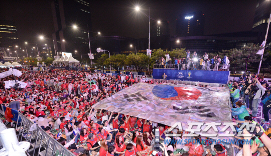 23일 오전 서울 삼성동 코엑스 영동대로에서 대한민국과 알제리의 브라질월드컵 H조 조별리그 2차전에 앞서 거리 응원전이 펼쳐졌다. 많은 관중들이 대형 태극기 응원을 하고 있다. 러시아와 1차전에서 무승부를 거둔 대한민국은 조 최하위 알제리를 상대로 조별리그 첫 승을 노린다.