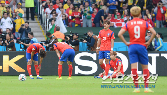 2014브라질월드컵 조별예선 대한민국과 알제리의 경기가 23일 (한국시간) 포르투 알레그레의 에스타디오 베이라리오 경기장에서 열렸다. 태극전사들이 알제리에게 세번째 골을 허용하고 침통한 표정을 짓고 있다.