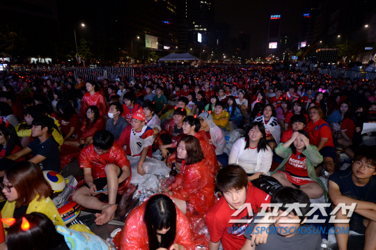 23일 새벽 브라질월드컵 대한민국과 알제리의 경기가 열리는 시간 서울 광화문과 영동대로 등 전국에서 대한민국을 응원하는 거리응원이 펼쳐졌다. 광화문을 찾은 수많은 시민들이 응원을 펼치고 있다. 전반 알제리에게 세 골을 허용하자 아쉬워하고 있는 시민들.