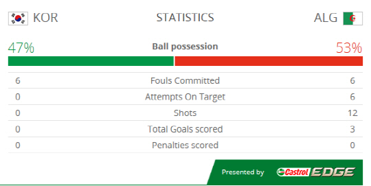 한국은 23일 오전 4시(한국시각) 브라질 포르투알레그리의 에스타디오 베이라-리우에서 펼쳐진 알제리와의 2014년 브라질월드컵 본선 조별리그 H조 2차전에서 전반 26분 알제리의 슬리마니, 전반 28분 라피크, 전반 38분 자부에게 연속골을 내주며 0-3으로 밀렸다. 전반 통계에서도 열세는 여실히 나타났다. 알제리는 무려 12개의 슈팅을 쏘아올렸다. 이중 절반인 6개가 유효슈팅이었고, 이중 3골을 성공시켰다. 한국은 단하나의 슈팅도 기록하지 못했다.