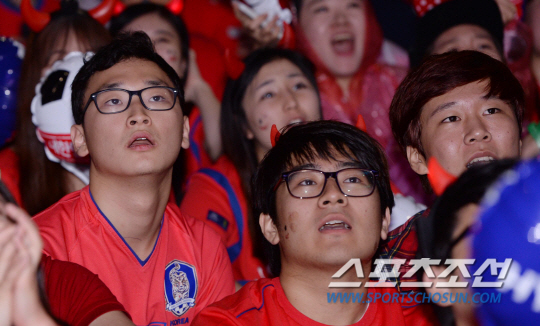 23일 오전 서울 삼성동 코엑스 영동대로에서 대한민국과 알제리의 브라질월드컵 H조 조별리그 2차전에 앞서 거리 응원전이 펼쳐졌다. 전반 한국이 골을 허용하자 응원단이 아쉬워하고 있다. 러시아와 1차전에서 무승부를 거둔 대한민국은 조 최하위 알제리를 상대로 조별리그 첫 승을 노린다.