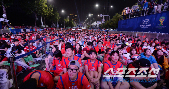 23일 오전 서울 삼성동 코엑스 영동대로에서 대한민국과 알제리의 브라질월드컵 H조 조별리그 2차전에 앞서 거리 응원전이 펼쳐졌다. 전반 한국이 골을 허용하자 응원단이 아쉬워하고 있다. 러시아와 1차전에서 무승부를 거둔 대한민국은 조 최하위 알제리를 상대로 조별리그 첫 승을 노린다.
