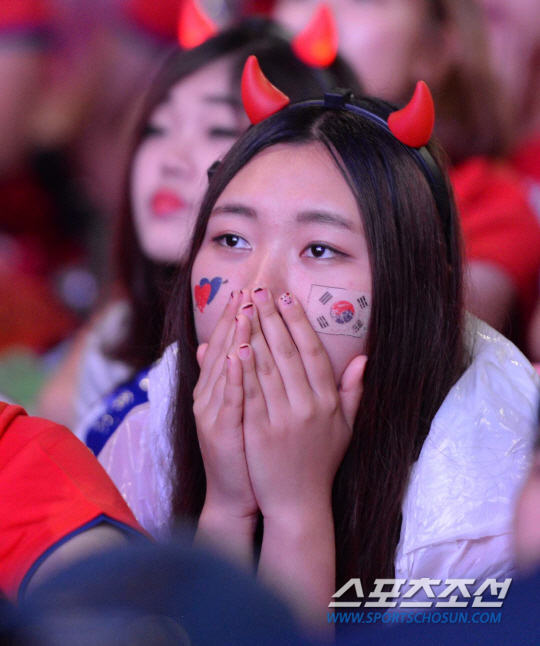 23일 오전 서울 삼성동 코엑스 영동대로에서 대한민국과 알제리의 브라질월드컵 H조 조별리그 2차전에 앞서 거리 응원전이 펼쳐졌다. 전반 한국이 골을 허용하자 응원단이 아쉬워하고 있다. 러시아와 1차전에서 무승부를 거둔 대한민국은 조 최하위 알제리를 상대로 조별리그 첫 승을 노린다.