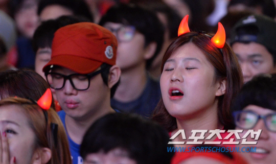 23일 오전 서울 삼성동 코엑스 영동대로에서 대한민국과 알제리의 브라질월드컵 H조 조별리그 2차전에 앞서 거리 응원전이 펼쳐졌다. 전반 한국이 골을 허용하자 응원단이 아쉬워하고 있다. 러시아와 1차전에서 무승부를 거둔 대한민국은 조 최하위 알제리를 상대로 조별리그 첫 승을 노린다.
