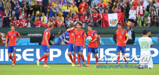 2014브라질월드컵 조별예선 대한민국과 알제리의 경기가 23일 (한국시간) 포르투 알레그레의 에스타디오 베이라리오 경기장에서 열렸다. 태극전사들이 알제리에게 세번째 골을 허용하고 침통한 표정을 짓고 있다.