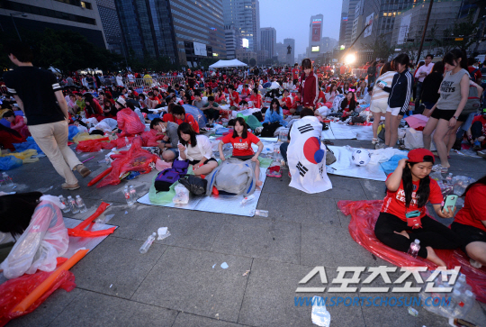 23일 새벽 브라질월드컵 대한민국과 알제리의 경기가 열리는 시간 서울 광화문과 영동대로 등 전국에서 대한민국을 응원하는 거리응원이 펼쳐졌다. 광화문을 찾은 수많은 시민들이 응원을 펼치고 있다. 전반 알제리에게 세 골을 허용하자 자리를 떠나고 있는 시민들.