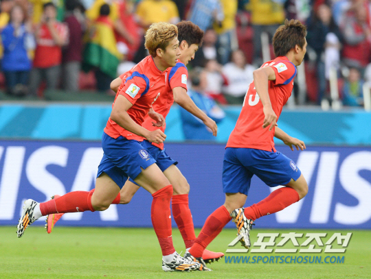 2014브라질월드컵 조별예선 대한민국과 알제리의 경기가 23일 (한국시간) 포르투 알레그레의 에스타디오 베이라리오 경기장에서 열렸다. 한국의 손흥민이 팀의 첫번째 골을 성공시키고 환호하고 있다.