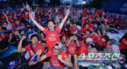 23일 오전 서울 삼성동 코엑스 영동대로에서 대한민국과 알제리의 브라질월드컵 H조 조별리그 2차전에 앞서 거리 응원전이 펼쳐졌다. 후반 손흥민의 골이 터지자 응원단이 환호하고 있다. 러시아와 1차전에서 무승부를 거둔 대한민국은 조 최하위 알제리를 상대로 조별리그 첫 승을 노린다.