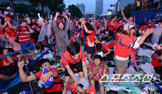 23일 오전 서울 삼성동 코엑스 영동대로에서 대한민국과 알제리의 브라질월드컵 H조 조별리그 2차전에 앞서 거리 응원전이 펼쳐졌다. 후반 손흥민의 골이 터지자 응원단이 환호하고 있다. 러시아와 1차전에서 무승부를 거둔 대한민국은 조 최하위 알제리를 상대로 조별리그 첫 승을 노린다.