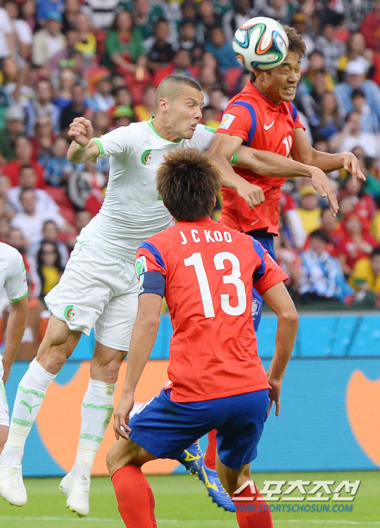 2014브라질월드컵 조별예선 대한민국과 알제리의 경기가 23일 (한국시간) 포르투 알레그레의 에스타디오 베이라리오 경기장에서 열렸다. 한국의 박주영이 문전에서 알제리 수비수와 볼을 다투고 있다.
