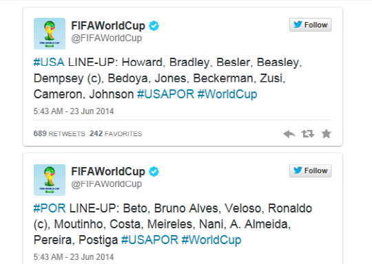 포르투갈은 베토, 브루노 알베스, 벨로소, 호날두, 무니뉴, 코스타, 메이렐레스, 나니, 알메이다, 페레리아, 포스티가가 선발 명단에 이름을 올렸다. 미국은 하워드 골키퍼와 브래들리, 베슬러, 비슬리, 뎀프시, 베도야, 존스, 벡커만, 주시, 캐머런, 존슨이 선발출전한다. 스포츠2팀