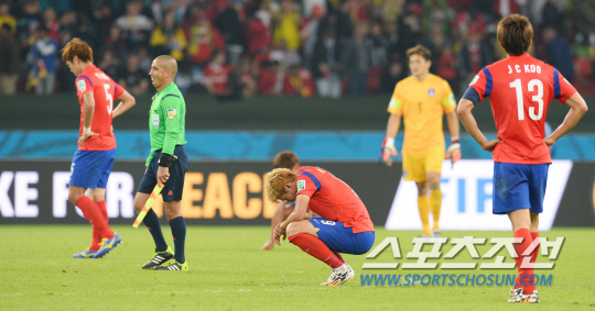 2014브라질월드컵 조별예선 대한민국과 알제리의 경기가 23일 (한국시간) 포르투 알레그레의 에스타디오 베이라리오 경기장에서 열렸다. 한국의 손흥민이 알제리에 2대4 패배를 확정지은후 그라운드에 주저앉아 있다.