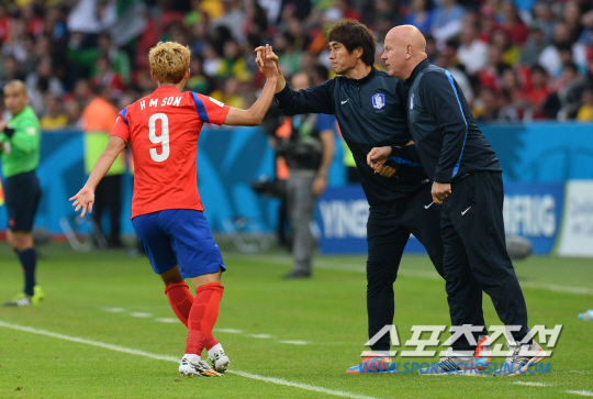 2014브라질월드컵 조별예선 대한민국과 알제리의 경기가 23일 (한국시간) 포르투 알레그레의 에스타디오 베이라리오 경기장에서 열렸다. 한국의 손흥민이 팀의 첫번째 골을 성공시키고 환호하고 있다.