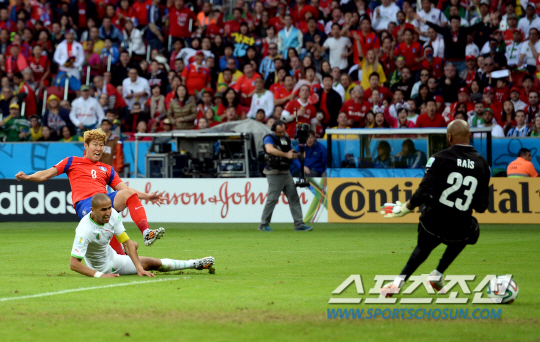2014브라질월드컵 조별예선 대한민국과 알제리의 경기가 23일 (한국시간) 포르투 알레그레의 에스타디오 베이라리오 경기장에서 열렸다. 한국의 손흥민이 팀의 첫번째 골을 성공시키고 있다.