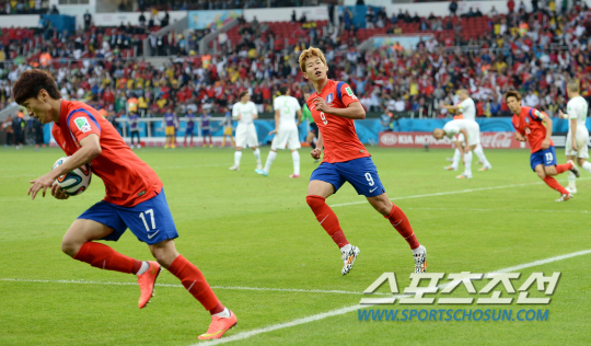 2014브라질월드컵 조별예선 대한민국과 알제리의 경기가 23일 (한국시간) 포르투 알레그레의 에스타디오 베이라리오 경기장에서 열렸다. 한국의 손흥민이 팀의 첫번째 골을 성공시키고 있다.