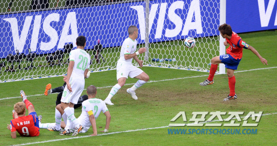 2014브라질월드컵 조별예선 대한민국과 알제리의 경기가 23일 (한국시간) 포르투 알레그레의 에스타디오 베이라리오 경기장에서 열렸다. 한국의 구자철이 문전 혼전 상황에서 무?냅막 걷어찬 공이 골망을 가르고 있다.